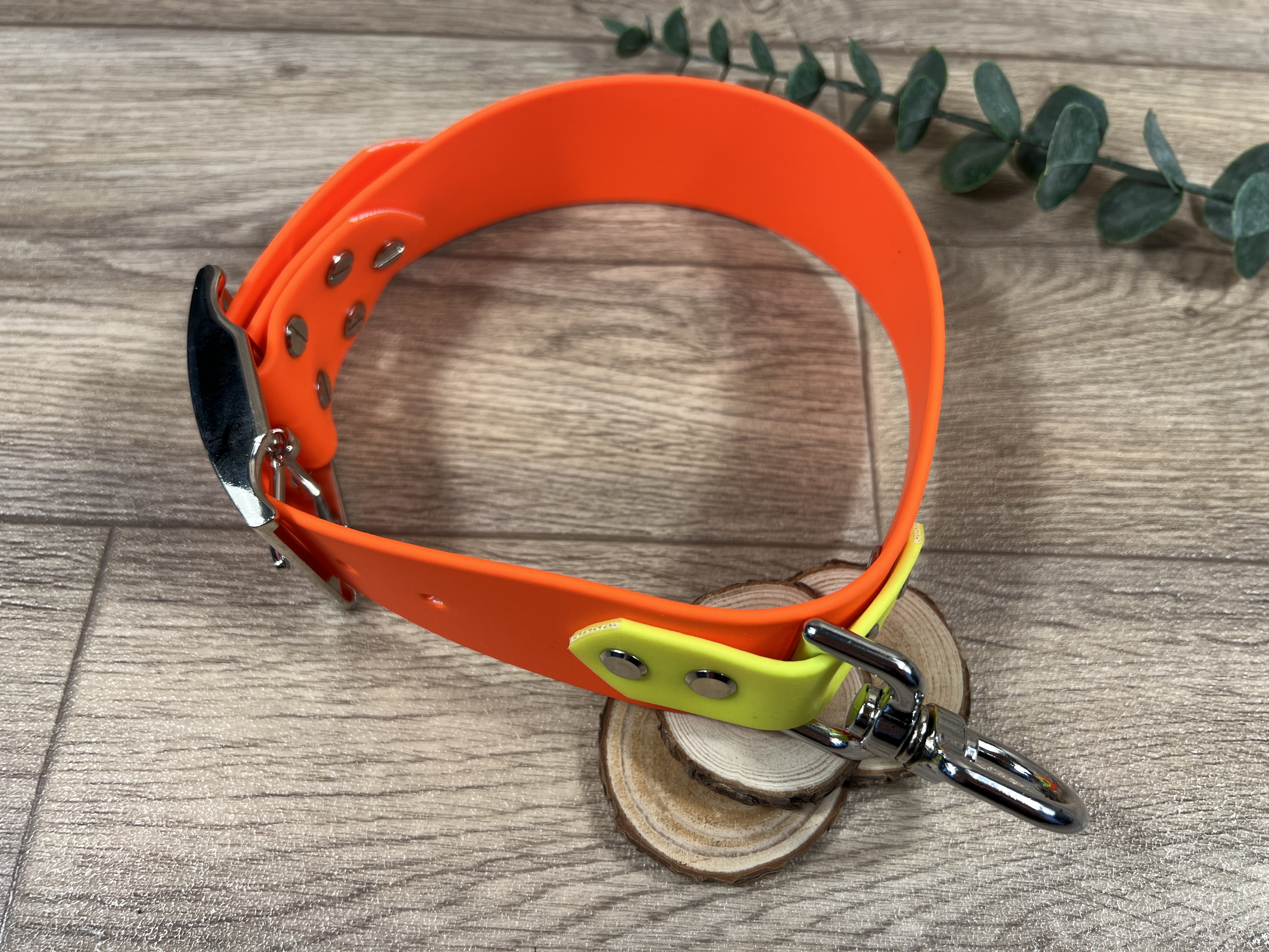 Dank der glatten Oberfläche liegt die Halsung angenehm an. Durch die auffälligen Farben eignet sie sich zudem gut als Jagdhalsung.